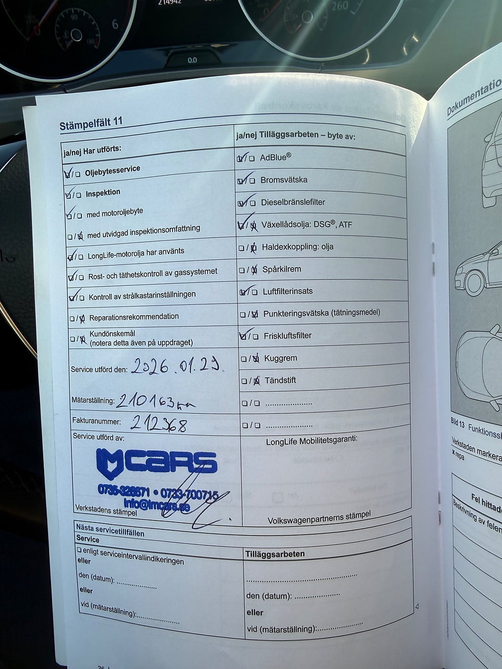 Avbländande innerbackspegel, Avstängningsbar airbag passagerare, Airbag passagerare fram (avstängningsbar), Parkeringssensorer (fram och bak), Parkeringsvärmare (Fjärrstyrd), Besiktigad t.o.m 2026-10-31, Nyservad vid 21016 mil (2026-01-24), Kamrem bytt vid 19963 mil (2025-03-10), Mycket välvårdad såväl invändigt som utvändigt.
